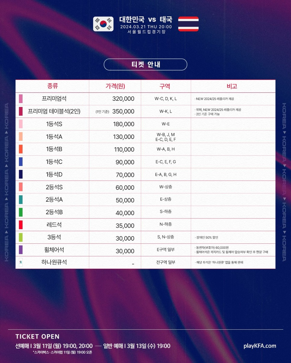 2026 월드컵 아시아 예선전 티켓은 프리미엄, 프리미엄 테이블석(2인), 1등석 S, A, B, C D, 등석 S, 레드석, 3등석 휠체어석 하나원큐 석(앱) 판매로 이루어져 있습니다.