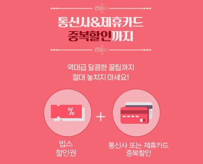- 통신사 또는 제휴 할인 카드 중복가능합니다( 할인권 선 차감 후 잔여 결제 금액에 대해 통신사(SKT, KT)또는 제휴카드 중복할인 최대 1회 가능합니다. 단 생일쿠폰, 마니아쿠폰, 현대 M포인트행사, SKT T Day 및 O day, CJ임직원 카드, 군인할인, 소방관할인, 돌잔치 등 제외)