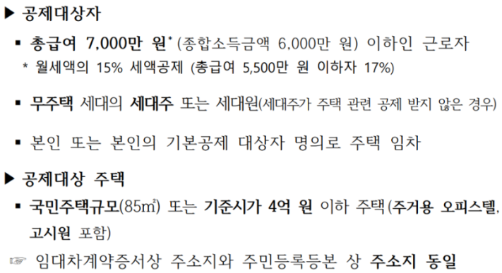 공제 금액은 총 급여 7,000만 원 이하 (종합소득 6,000만 원 이하) 월세액의 15% 세액공제