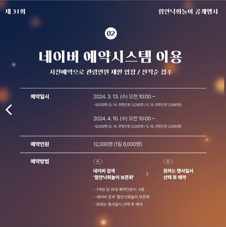 이번 2024년 함안 낙화놀이느 작년 함안 낙화놀이에 수많은 인파가 몰려 안전문제가 발생할 상황을 고려해 함안낙화보존회 및 함안군청에서 2024년 함안 낙화놀이의 사전예약제를 운영하고 있습니다.